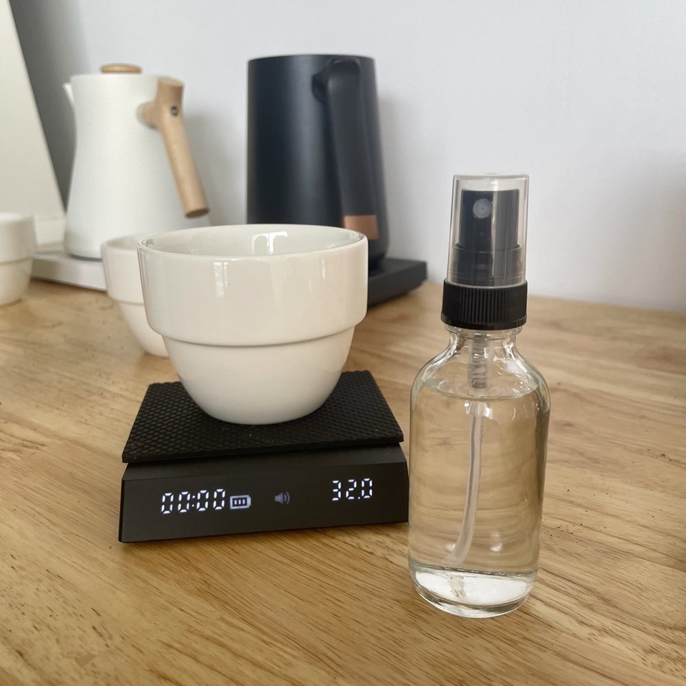 Prends un minuscule flacon pulvérisateur et vaporise doucement tes grains de café pré-dosés. Cette méthode est précise et permet de s'assurer que seules les plus petites gouttelettes d'eau atterrissent sur le café. Cependant, à moins de vaporiser dans un récipient très peu profond, il serait facile de rater les grains les plus bas, ce qui provoquerait un déséquilibre dans les niveaux d'humidité qui causerait encore un peu d'électricité statique dans le moulin. Tu peux résoudre ce problème en secouant ou en remuant tes grains avant de les ajouter à la trémie.